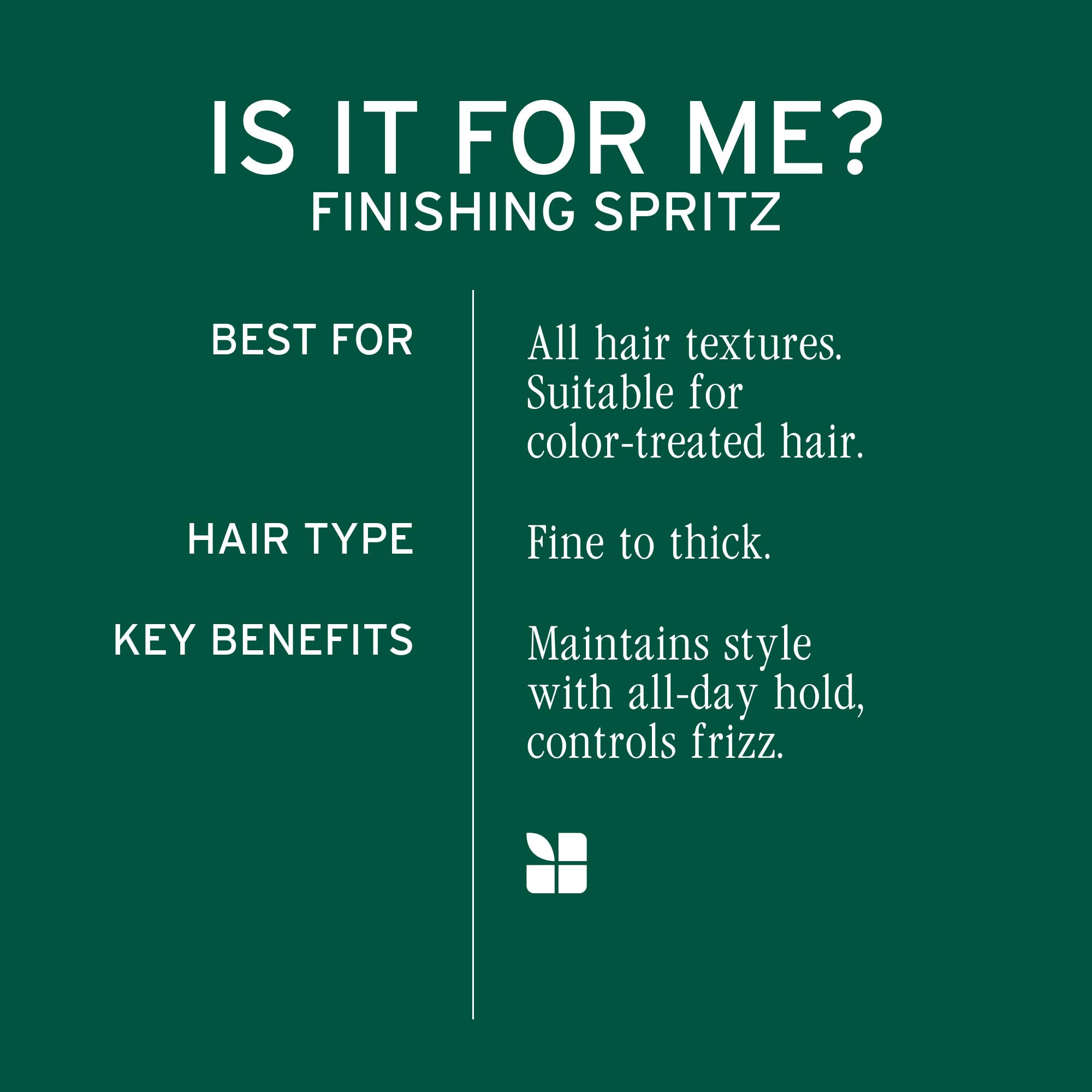 - Finishing Spritz: Non-aerosol hairspray that provides strong hold without stickiness or flaking