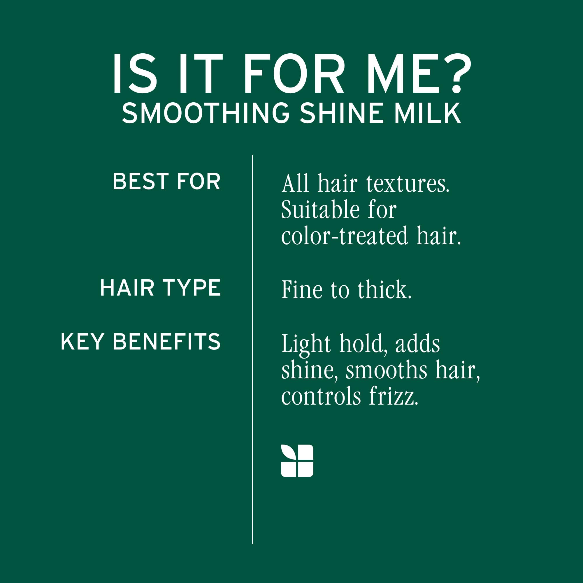 - Smooth Shine Milk: Provides flexible hold, smoothing hair while preventing frizz and flyaways. Adds shine for a glossy finish with a weightless feel.