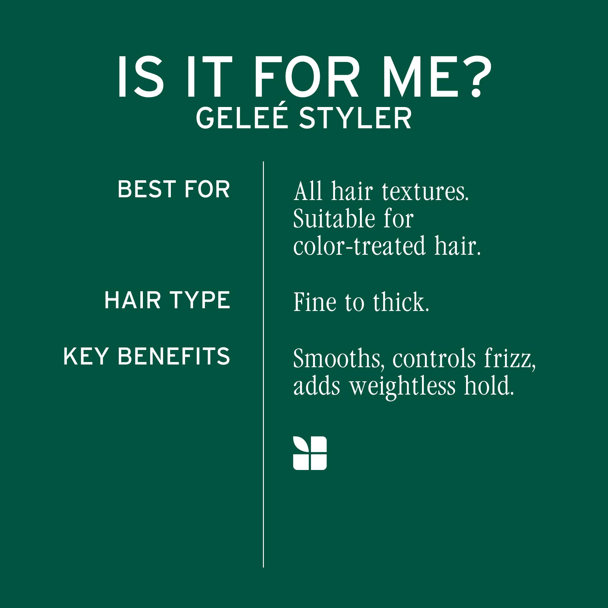 • Styling Gelée: Create hold and control without crunch with Gelee Styler. Ideal for any hair type, this all-purpose gel smooths your strands with a medium hold, taming flyaways and frizz.